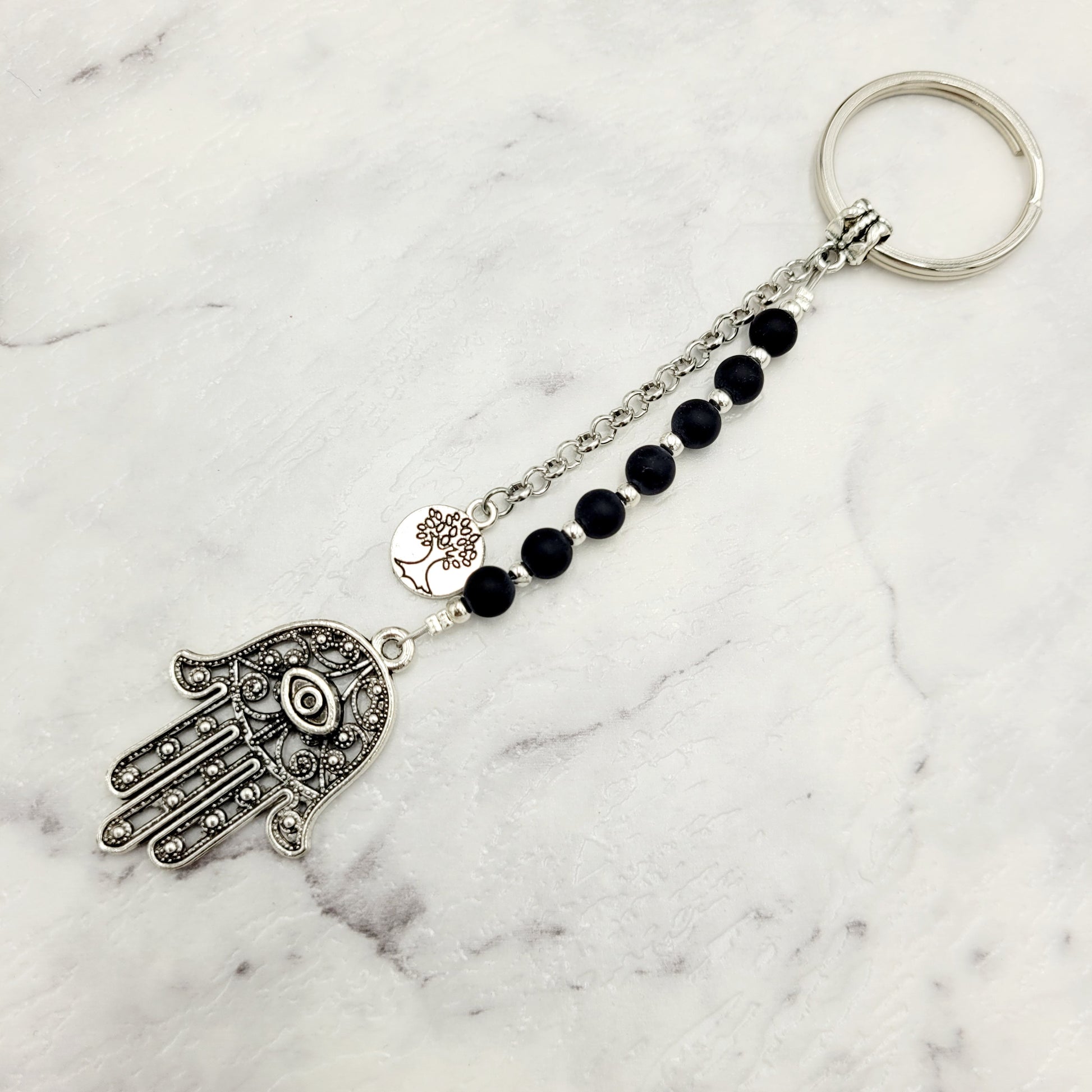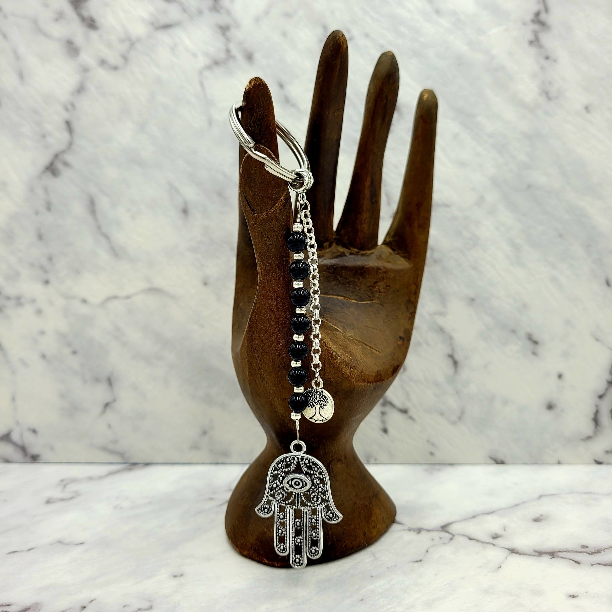 Our Obsidian Hamsa Crystal Charm Keyring is designed to inspire a mindful lifestyle. Crafted with an obsidian gemstone, it provides the wearer with grounding energy, helping to uncover the truth, while the hamsa helps ward off negativity and promote good luck and protection. Carry this exquisite piece in your pocket and live a life of grace and protection.