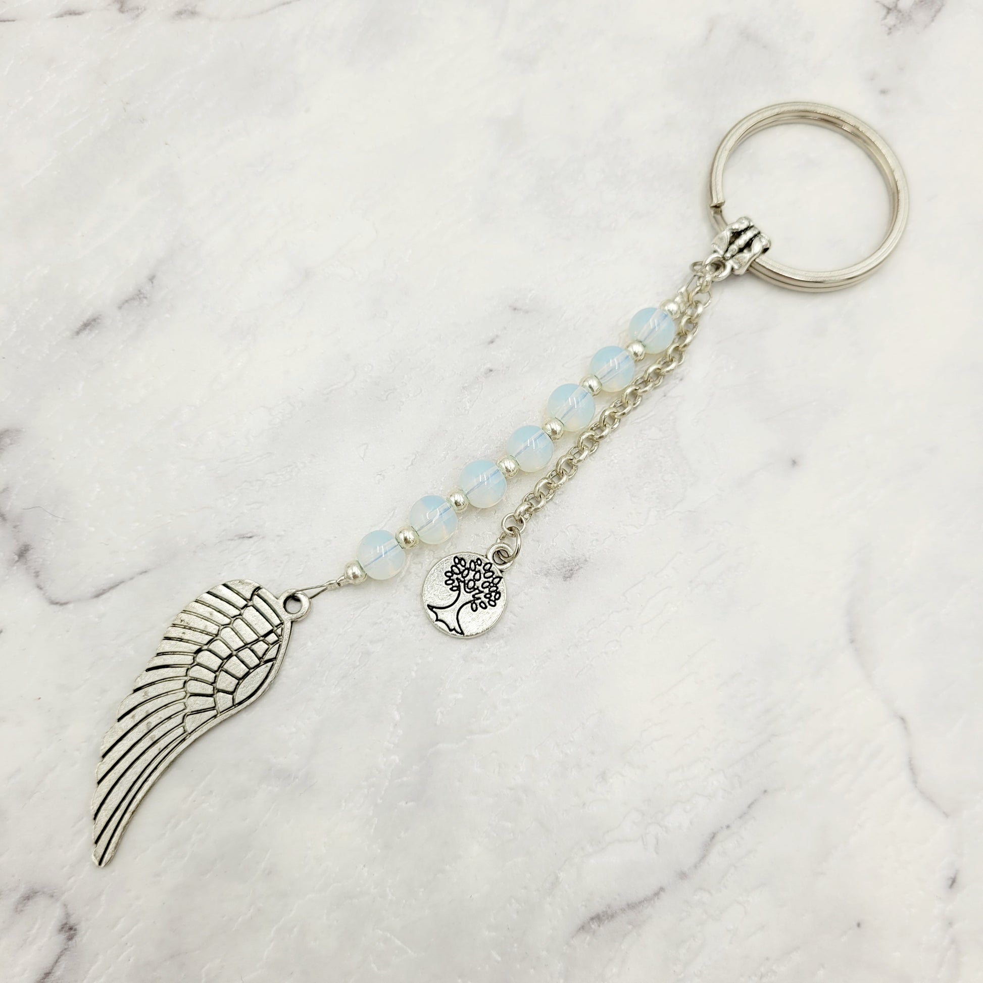 This Opalite Angel Wing Crystal Charm Keyring is the perfect accessory for those looking for spiritual protection and guidance. Opalite is believed to promote calmness, overcome fatigue, and aid communication on a spiritual level. Embellished with an angel wing charm, this keyring acts as a symbol of love and protection. Ideal for meditation or everyday use.