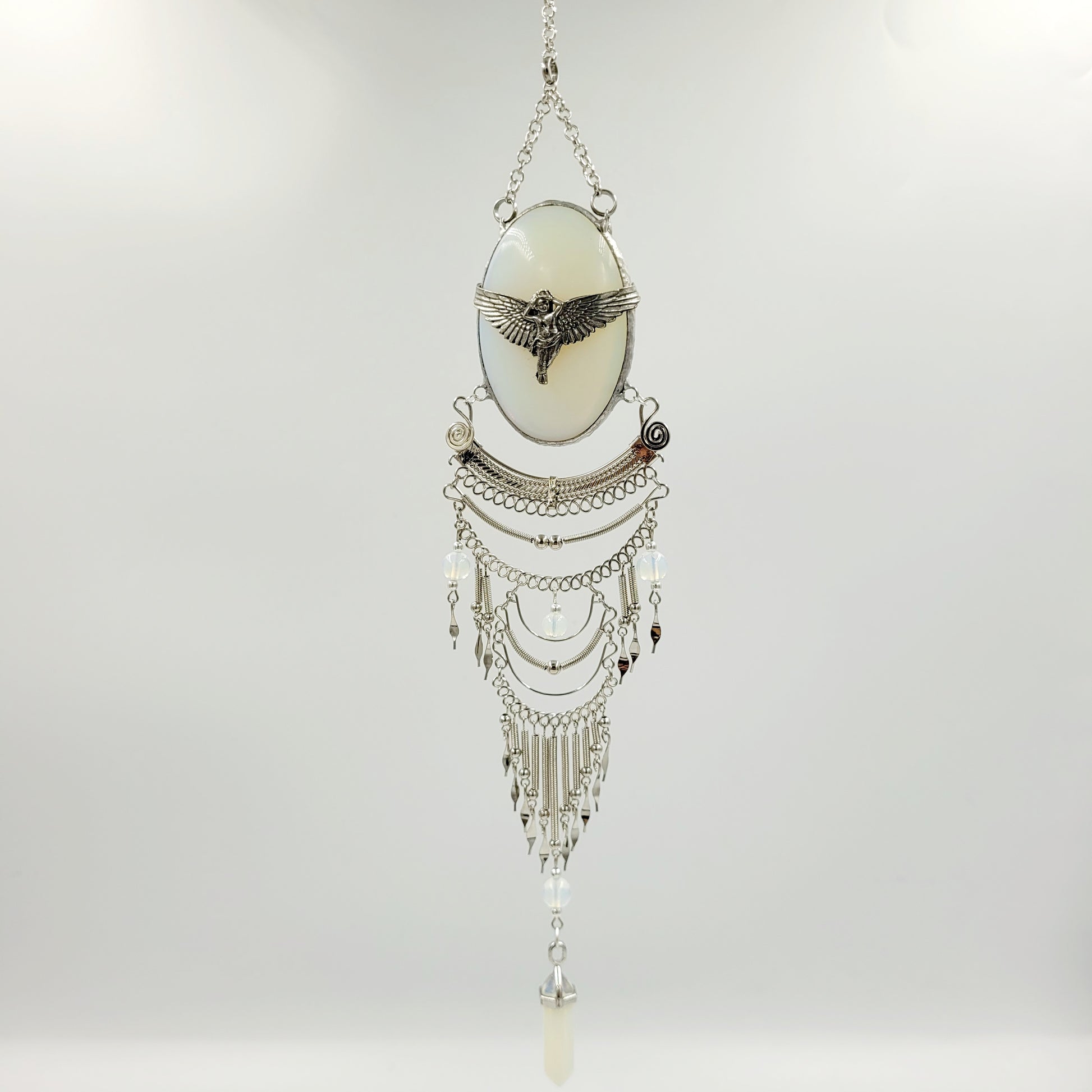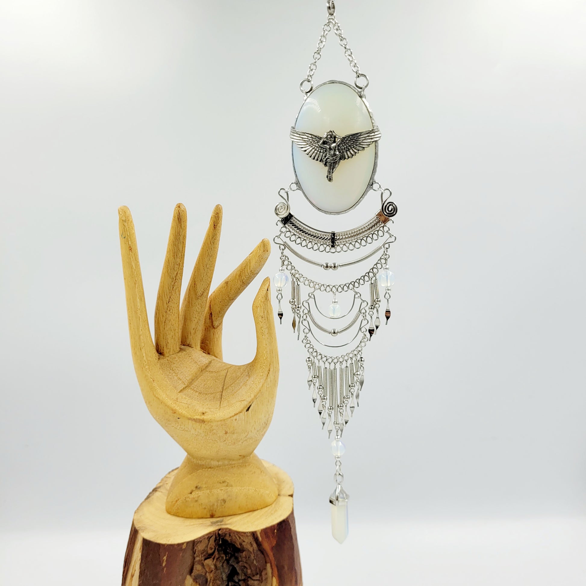 The Opalite Hanging Oval is a beautiful and unique piece of decor meant to enhance the energy of your home. Crafted from opalite, this piece is known to promote mental clarity and help to keep the energy in your home peaceful and calm. A special addition to any home.