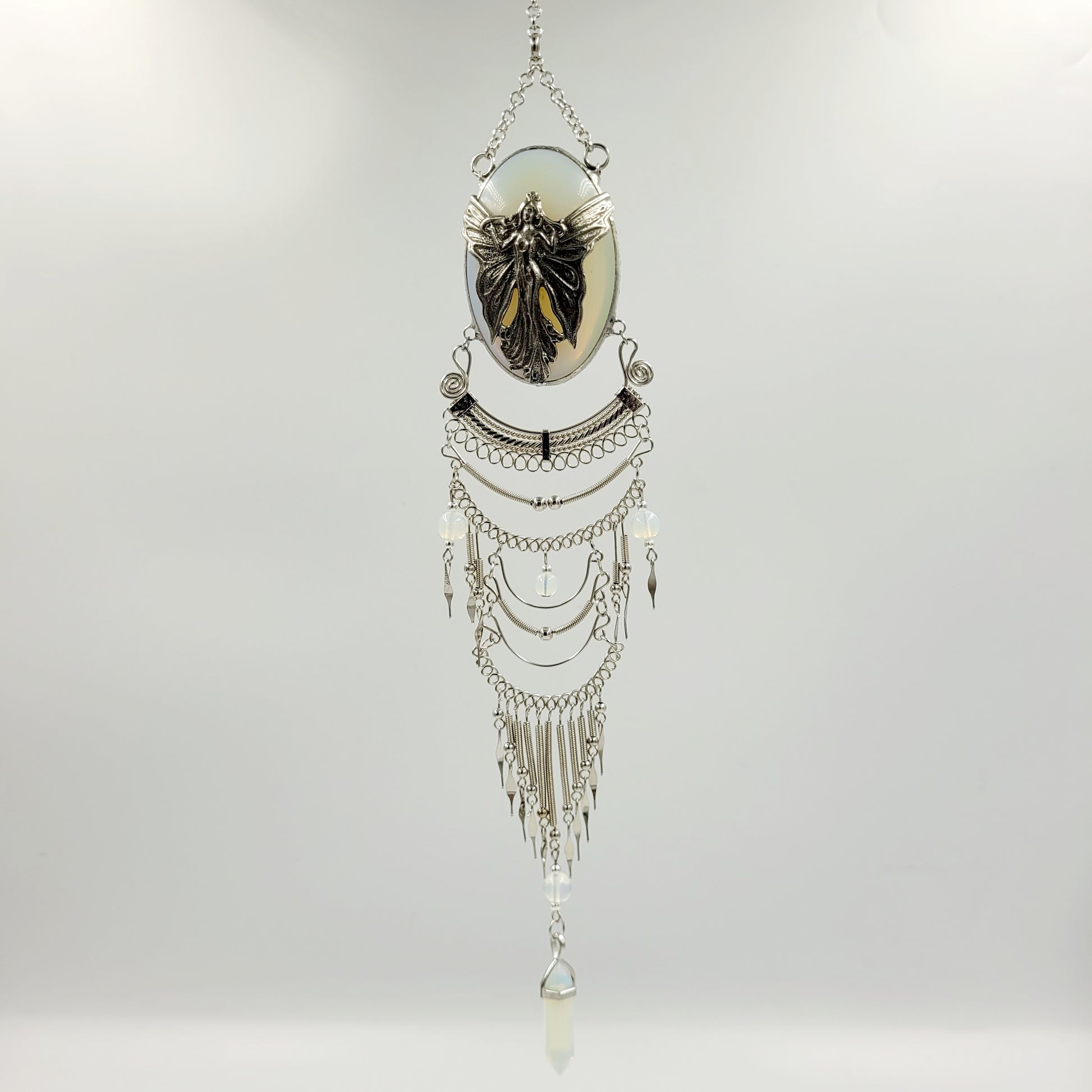 The Opalite Hanging Oval is a beautiful and unique piece of decor meant to enhance the energy of your home. Crafted from opalite, this piece is known to promote mental clarity and help to keep the energy in your home peaceful and calm. A special addition to any home.