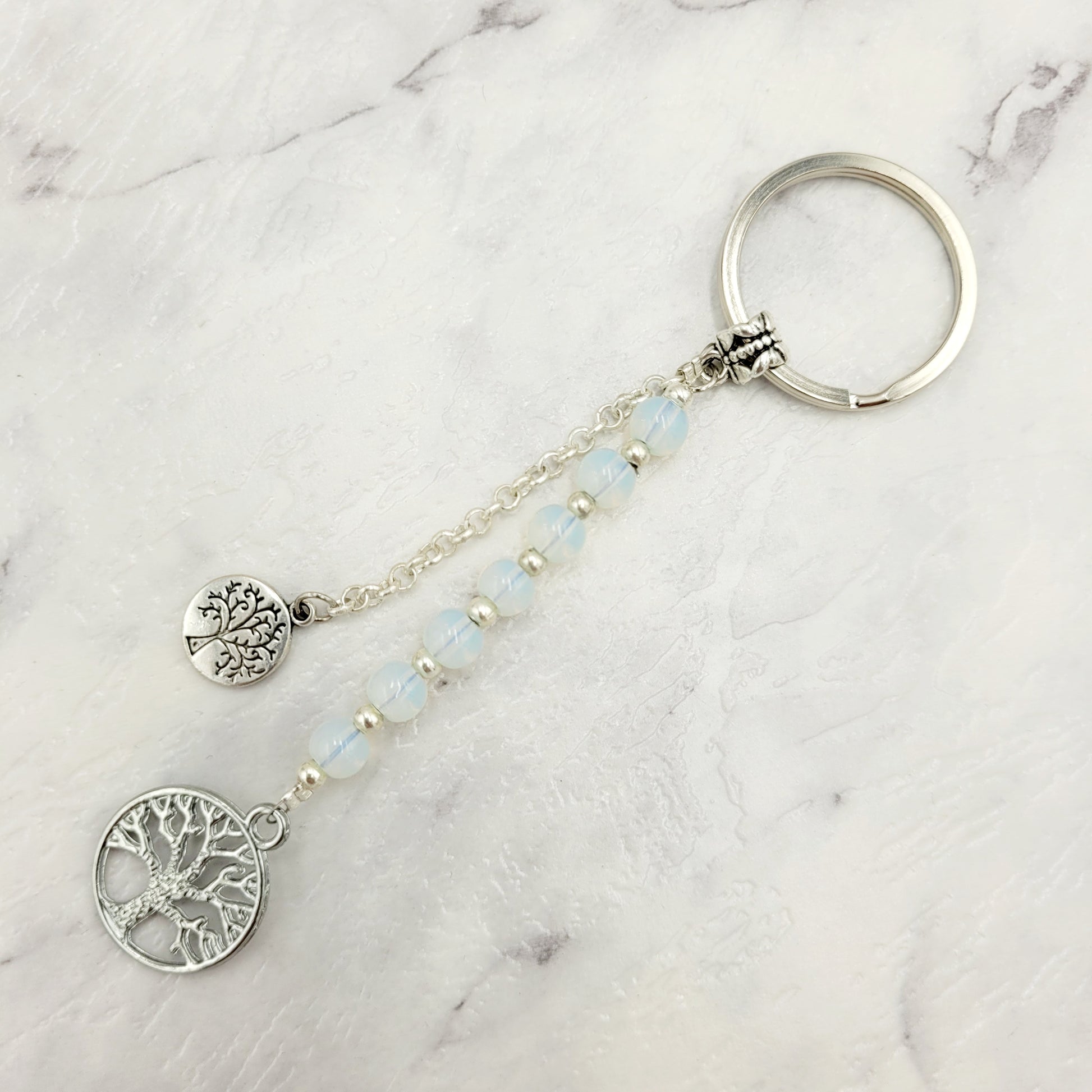 This Opalite Tree of Life Crystal Charm Keyring will help you stay connected to the universe and bring peace, relaxation and strength to your life. It's believed to help with mood stabilization and spiritual communication, making it great for meditation. Perfect for those wanting to experience new beginnings and growth.