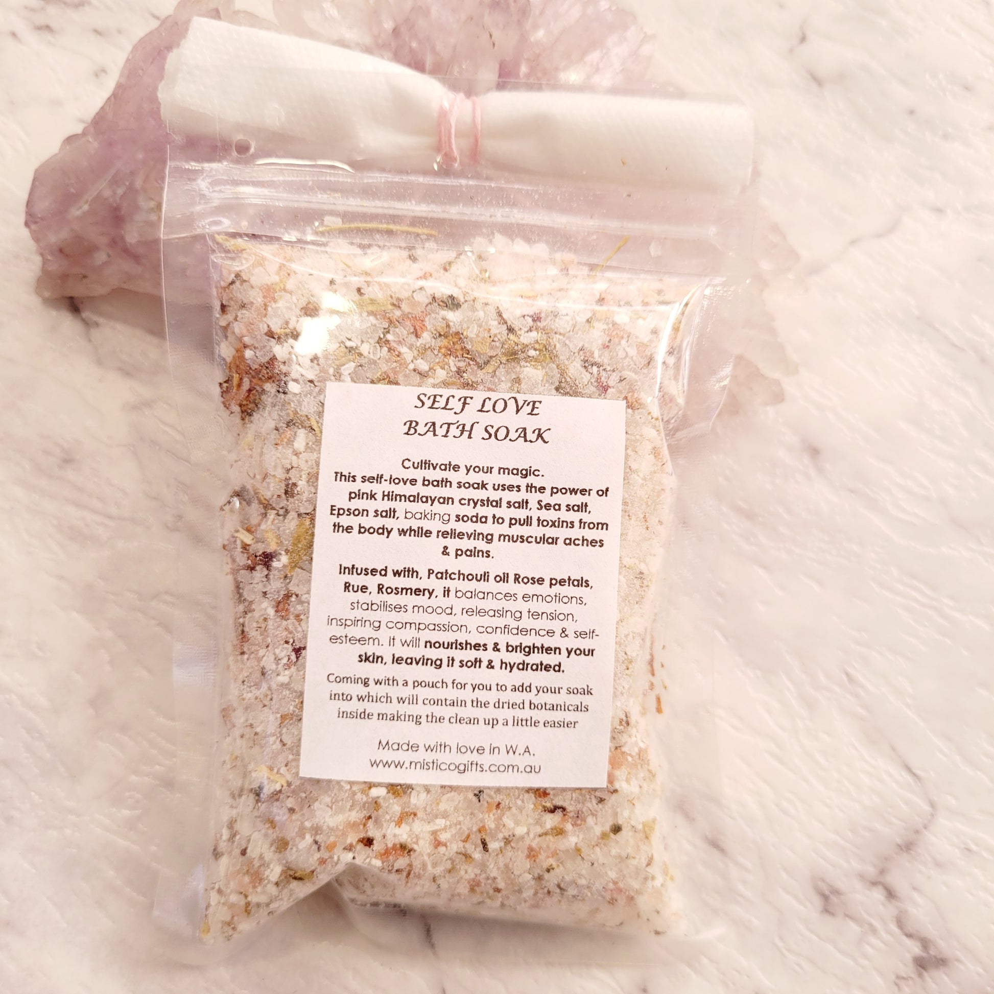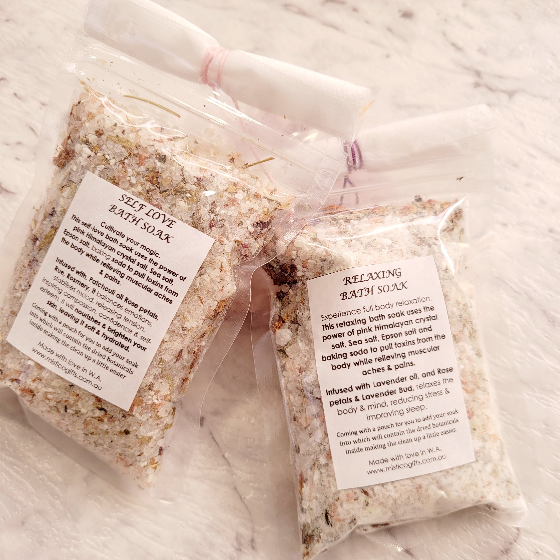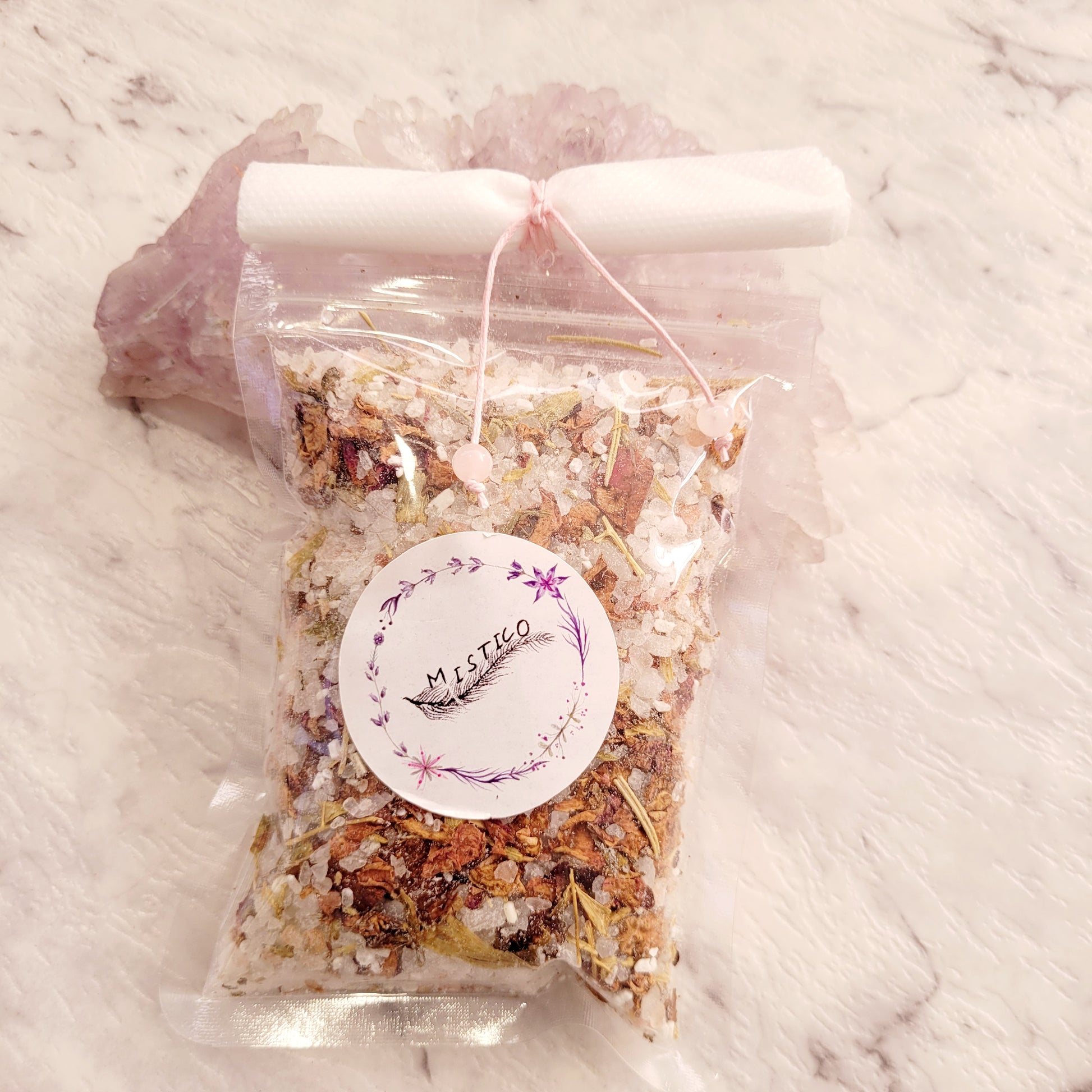 Indulge in ultimate self-care with our Organic Flowers Bath Soak. Infused with pink Himalayan crystal salt, Sea salt, Epson salt, and baking soda, it detoxifies and relieves muscular aches and pains. Patchouli oil, Rose petals, Rue, and Rosmery promote emotional balance and nourish the skin. The included reusable cotton pouch makes cleanup a breeze.