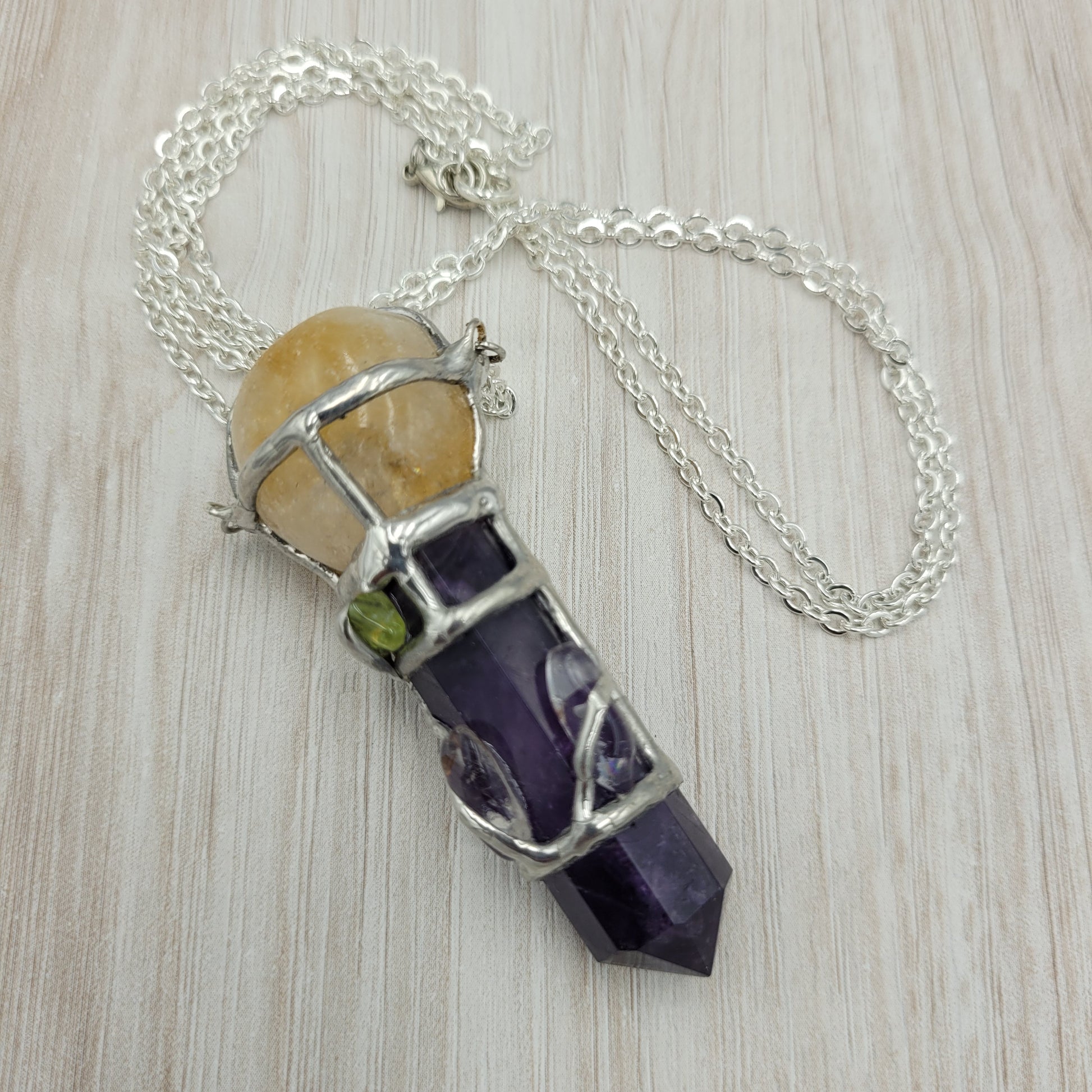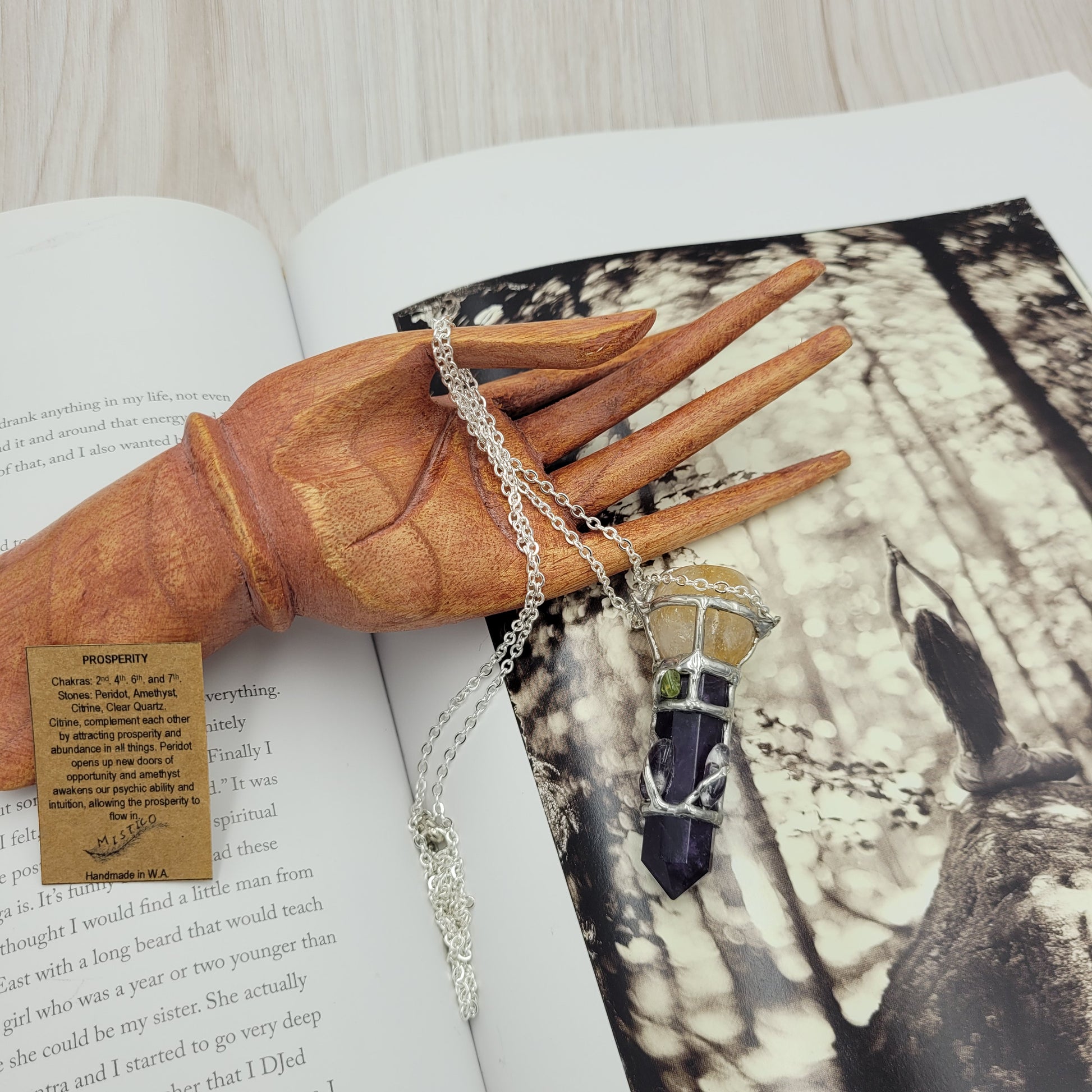 Peridot, Amethyst, Citrine, and Clear Quartz energies work together to open up new doors of opportunity, attract prosperity and abundance, awaken intuition, and support the flow of abundance. Each stone is connected to a specific chakra, including the 2nd, 4th, 6th, and 7th.