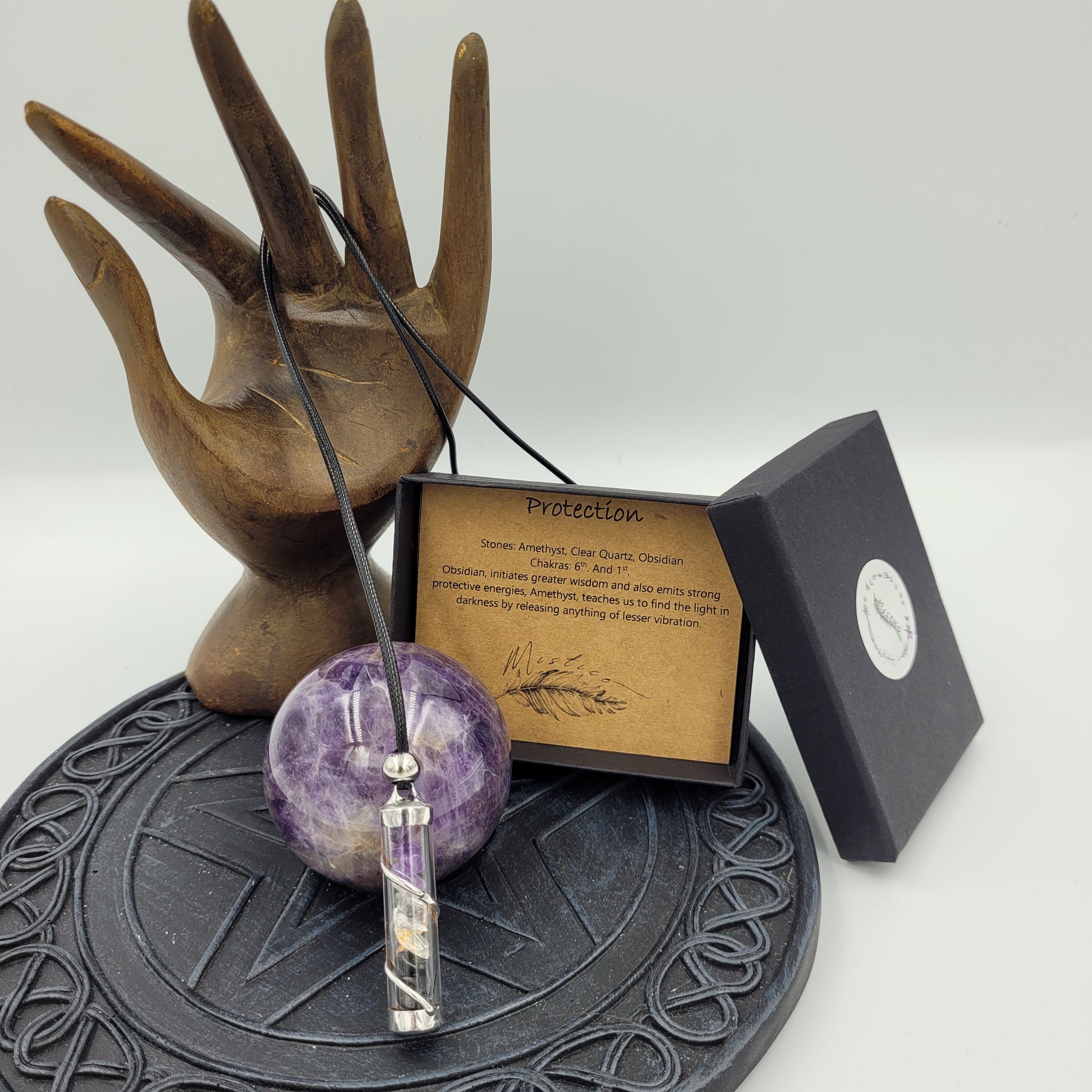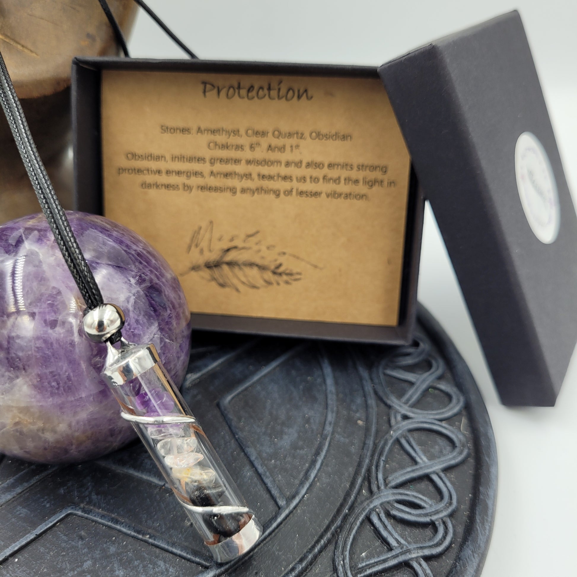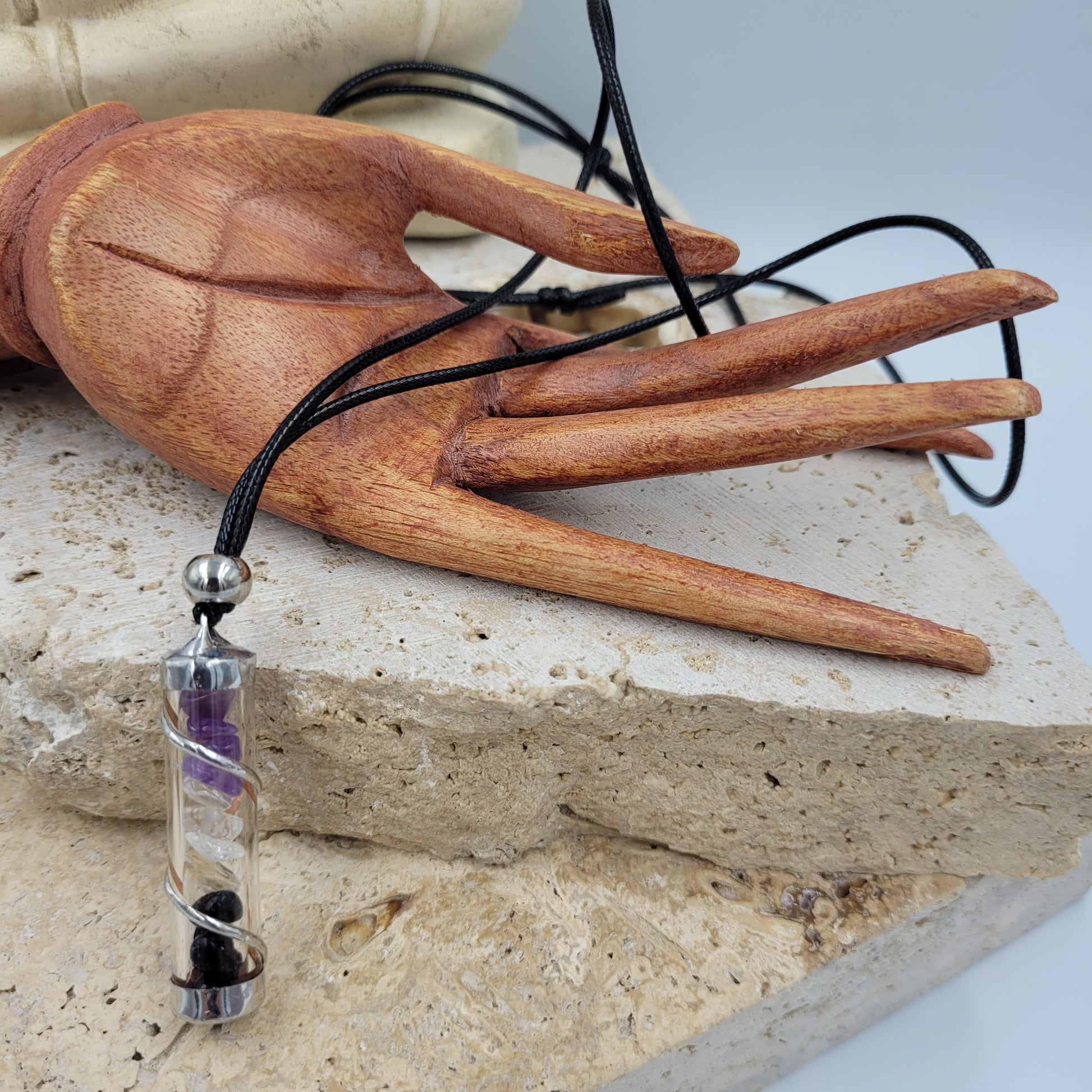 Guard yourself against negative energies with the Protection Crystal Filled Tube Necklace. Crafted with Obsidian, Amethyst, and Clear Quartz, this powerful healing tool can help activate your 6th and 1st Chakras, promoting wisdom and emitting protective energy. Enjoy the peace of mind that comes with spiritual protection.