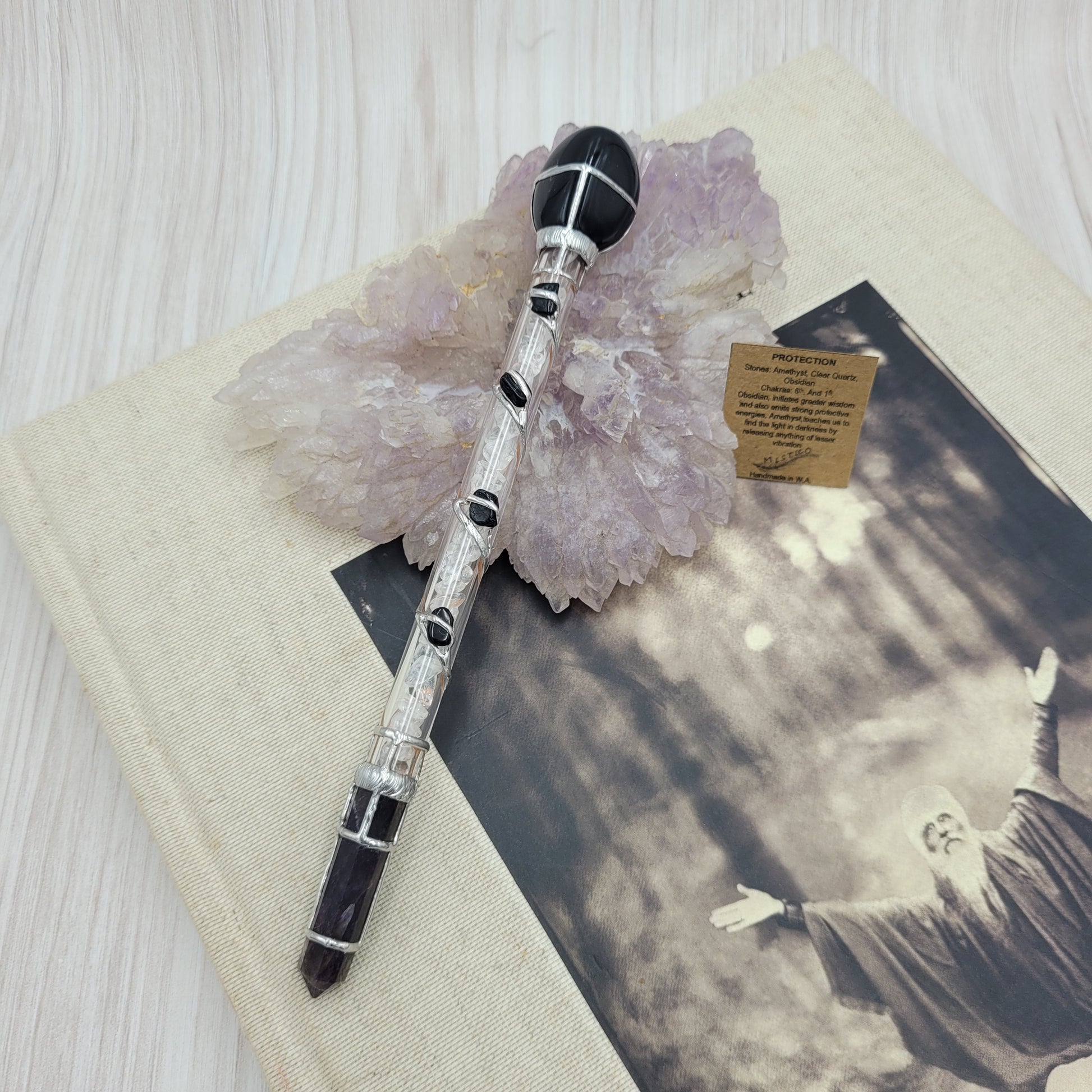 Guard yourself against negative energies with the Protection Wand. Crafted with Obsidian, Amethyst, and Clear Quartz, this powerful healing tool can help activate your 6th and 1st Chakras, promoting wisdom and emitting protective energy. Enjoy the peace of mind that comes with spiritual protection.
