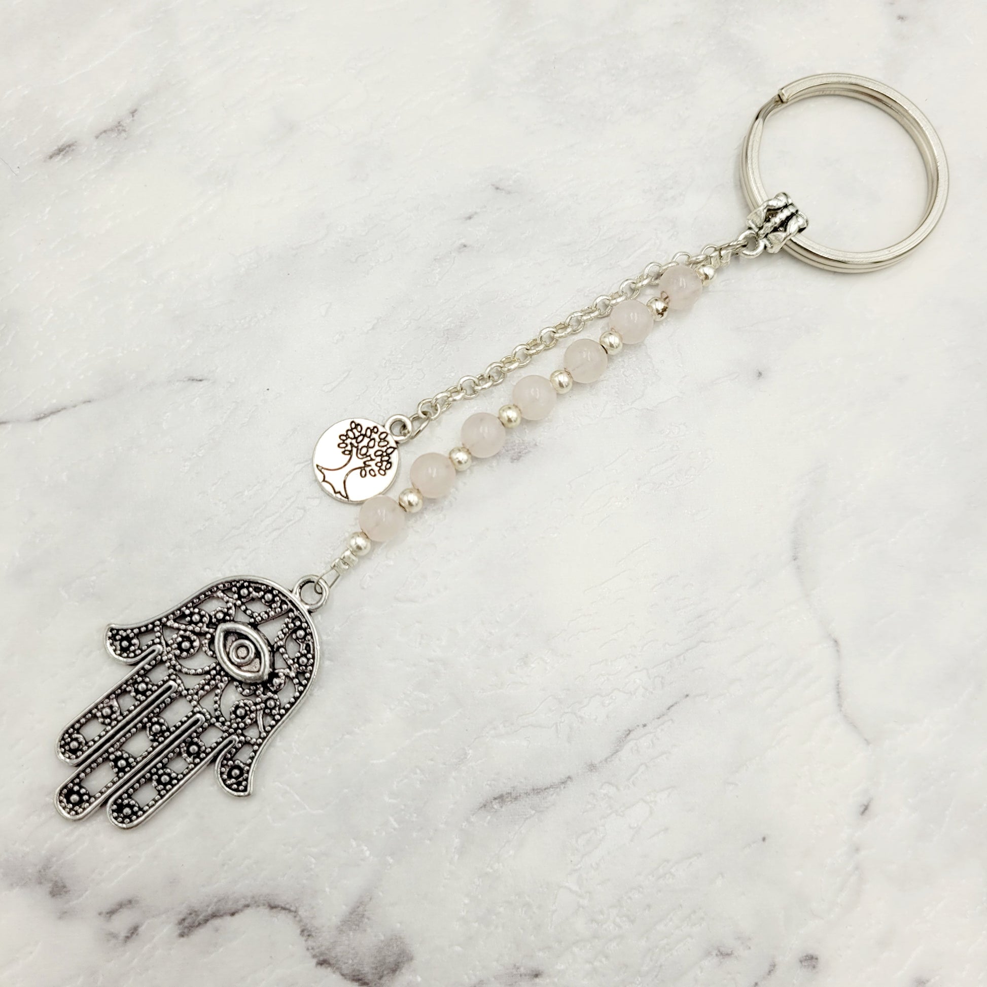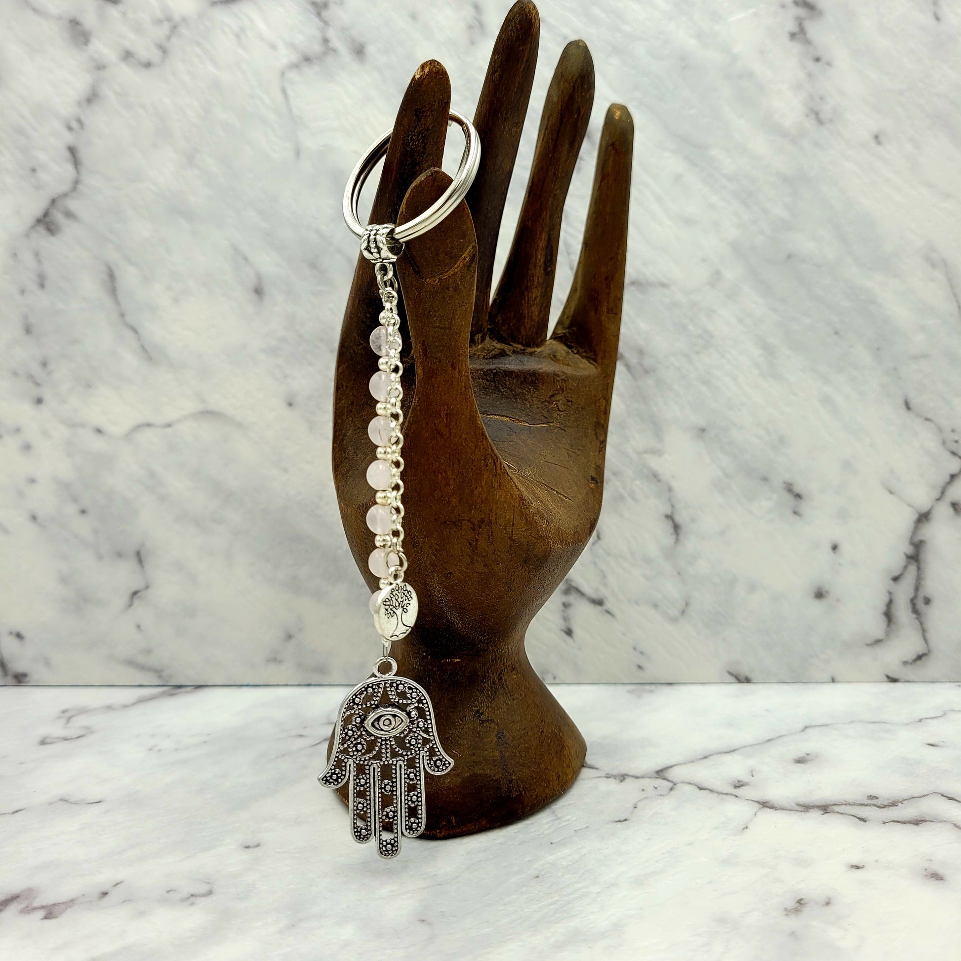 Bring good luck and protection to your day with the Rose Quartz Hamsa Crystal Charm Keyring. Crafted from powerful Rose Quartz, the charm helps draw in self-love and remove negative energy, restoring your mind to balance. An ancient symbol of protection, the Hamsa is revered for warding off evil and promoting good luck.