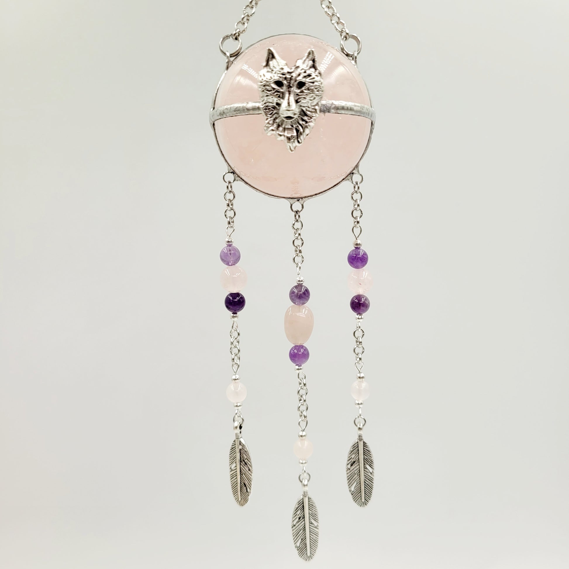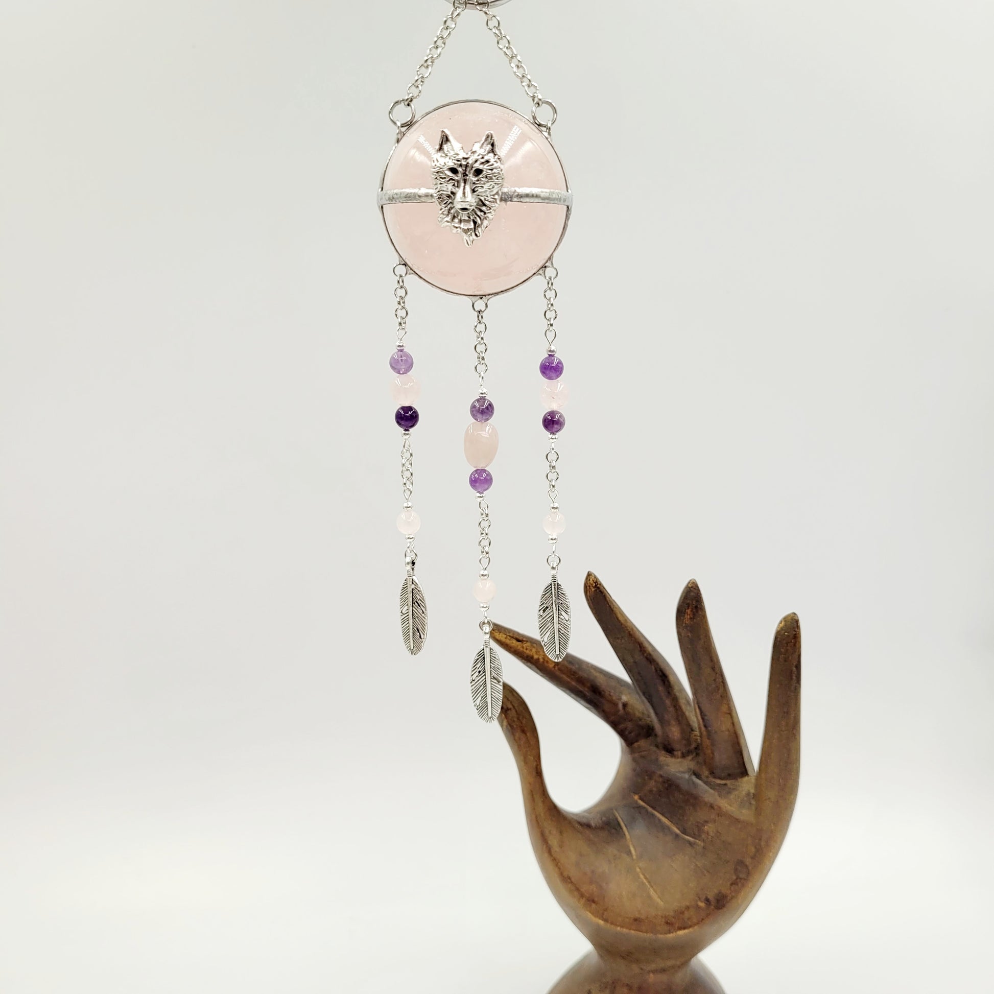 Hang these Rose Quartz Hanging Sphere / Wolf in your home or office to bring a calming, peaceful atmosphere. Rose quartz is believed to bring love and harmony and is an excellent source of serenity.