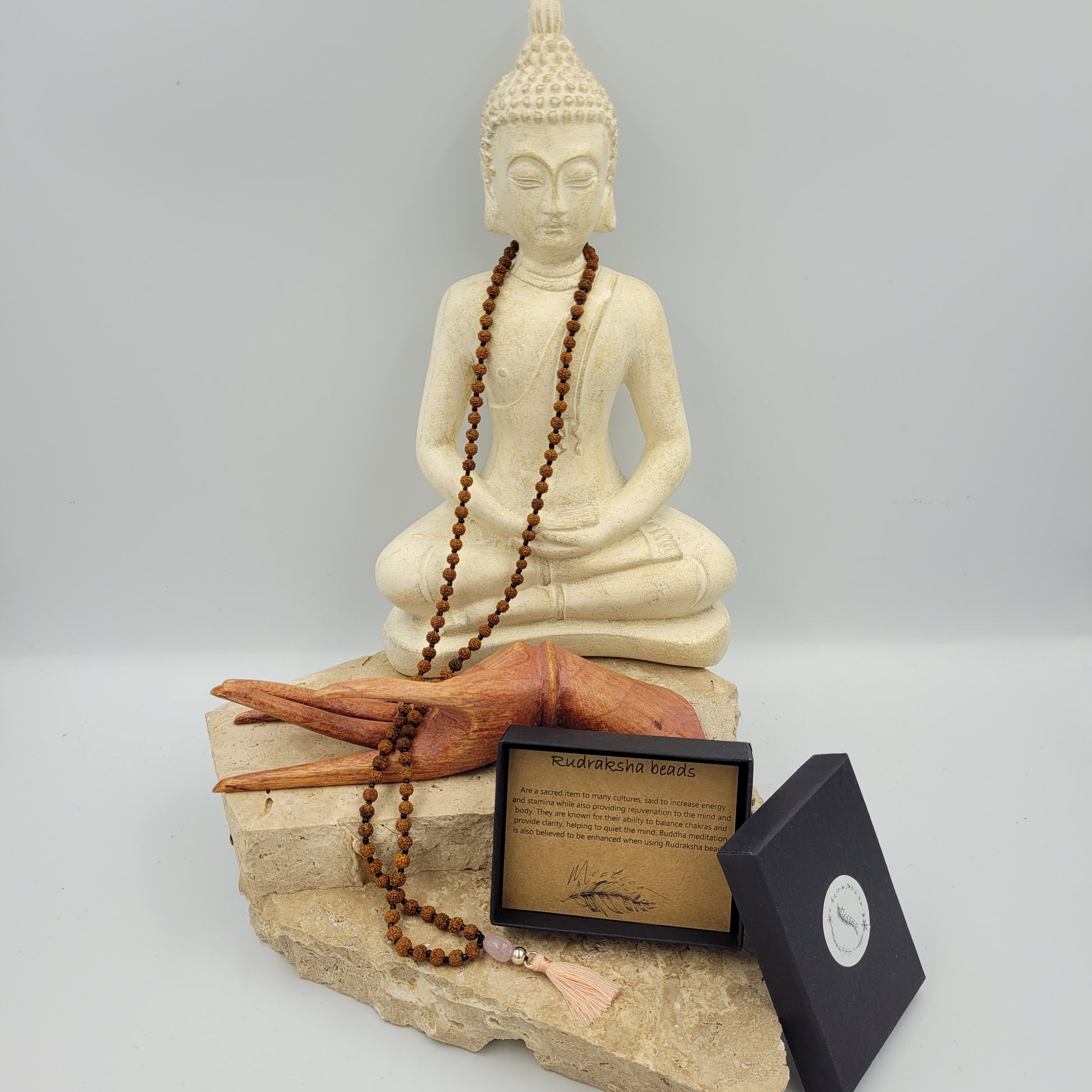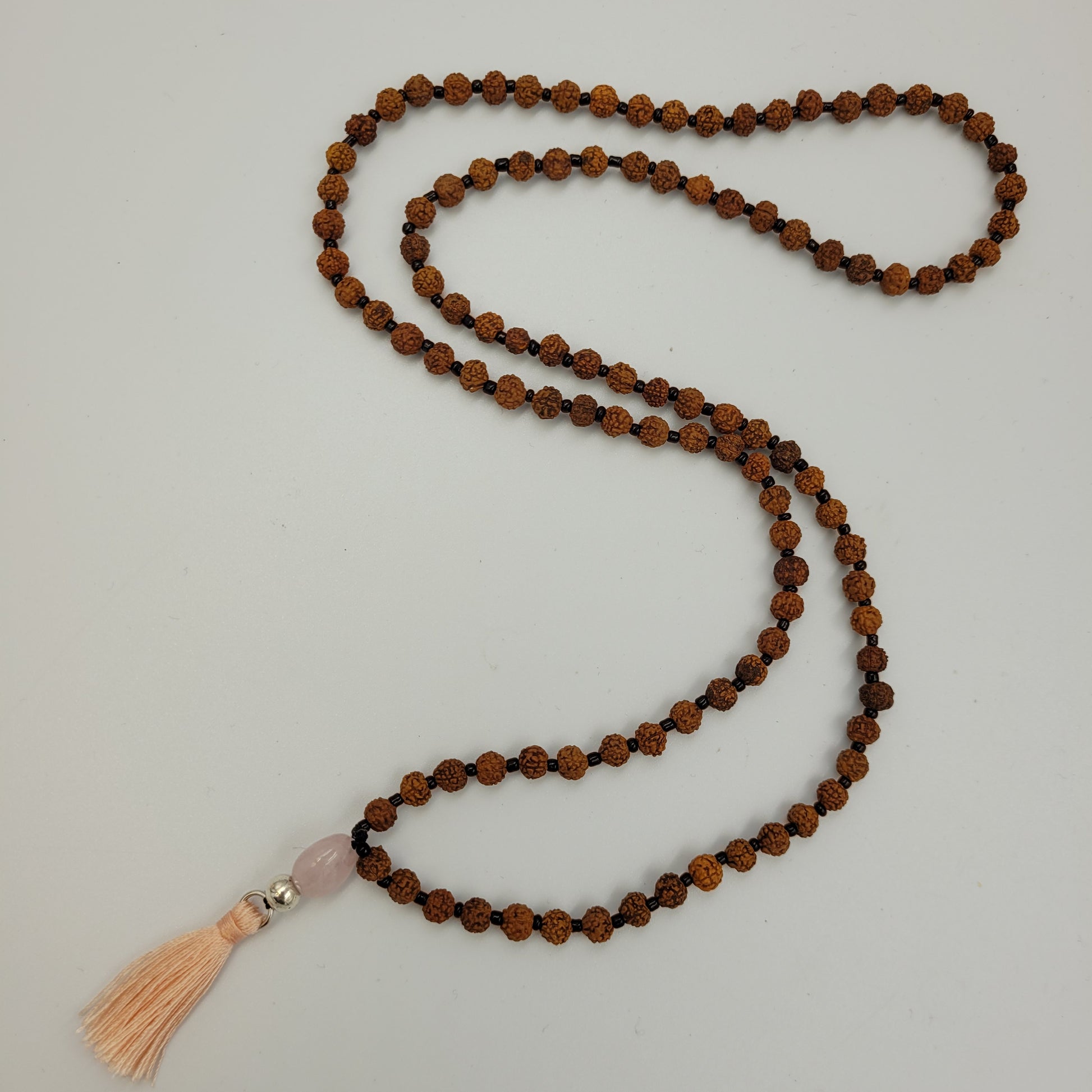 This Rudraksha Beads/ Rose Quartz Necklace is a special item cherished by many cultures to help refresh the body and soul. Its said to help invigorate your energy, balance your chakras and nurture the mind, helping to bring clarity and inner peace. A perfect accessory for meditation.