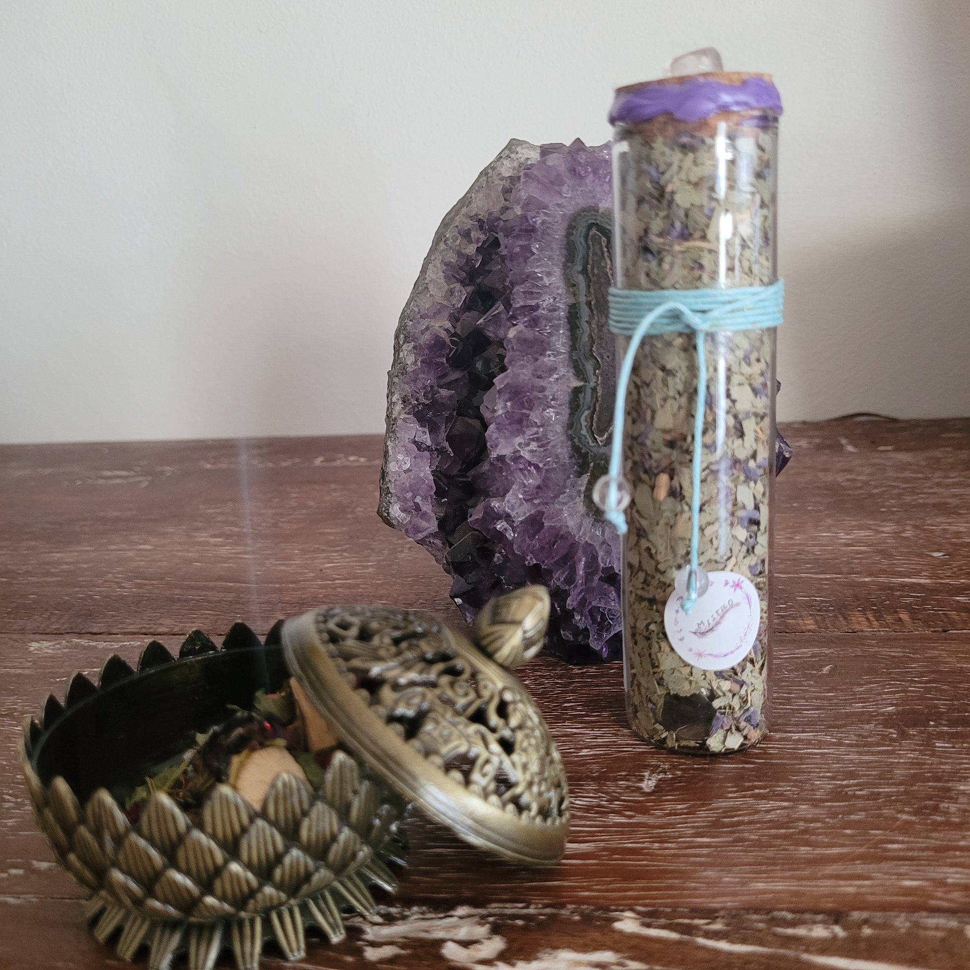 The Sacred Smudge is an aromatic herbal incense blend crafted with the finest herb and spices and flowers to cleanse and purify your spiritual and emotional body. Prepared in a ritual ceremony infused with Clear Quartz Crystal.