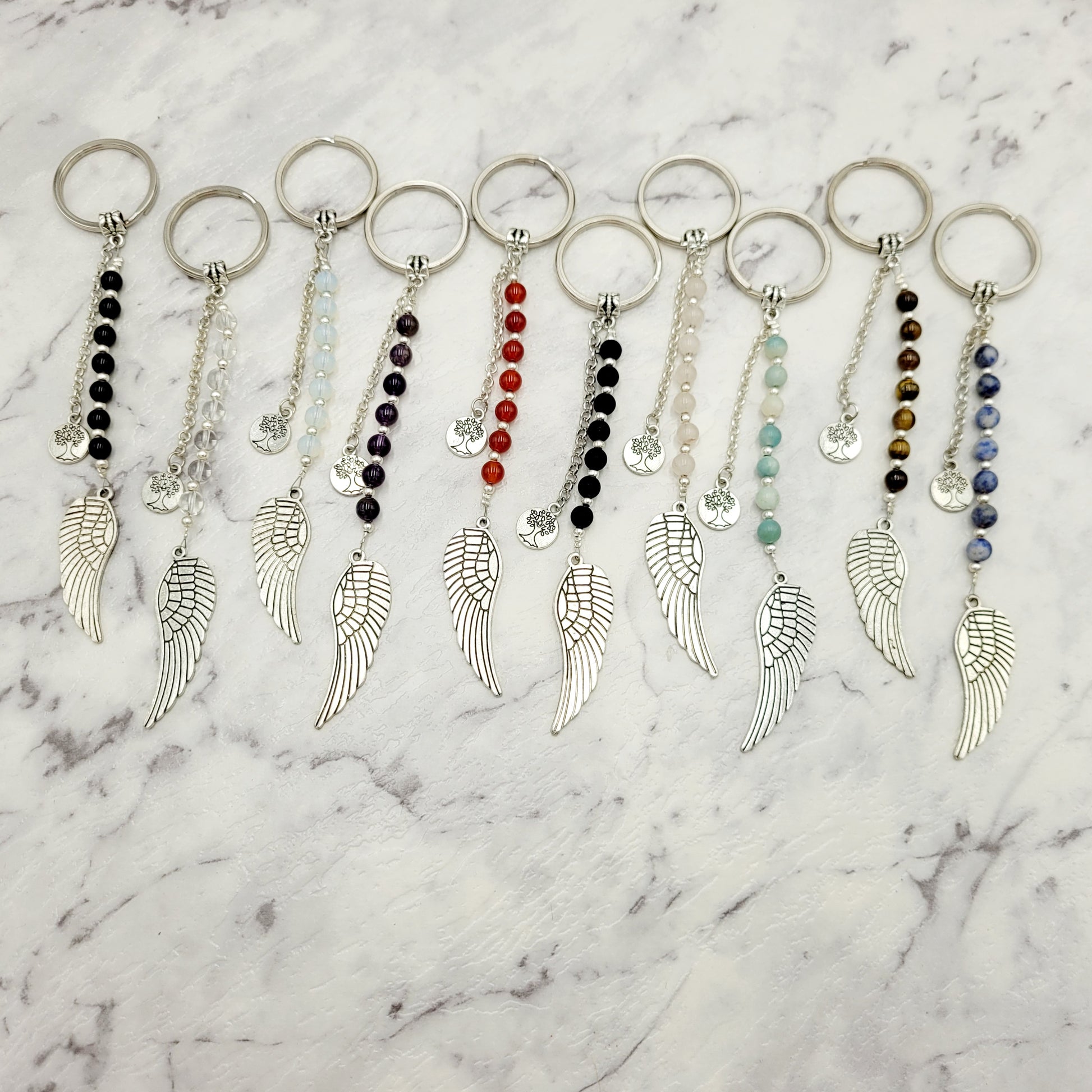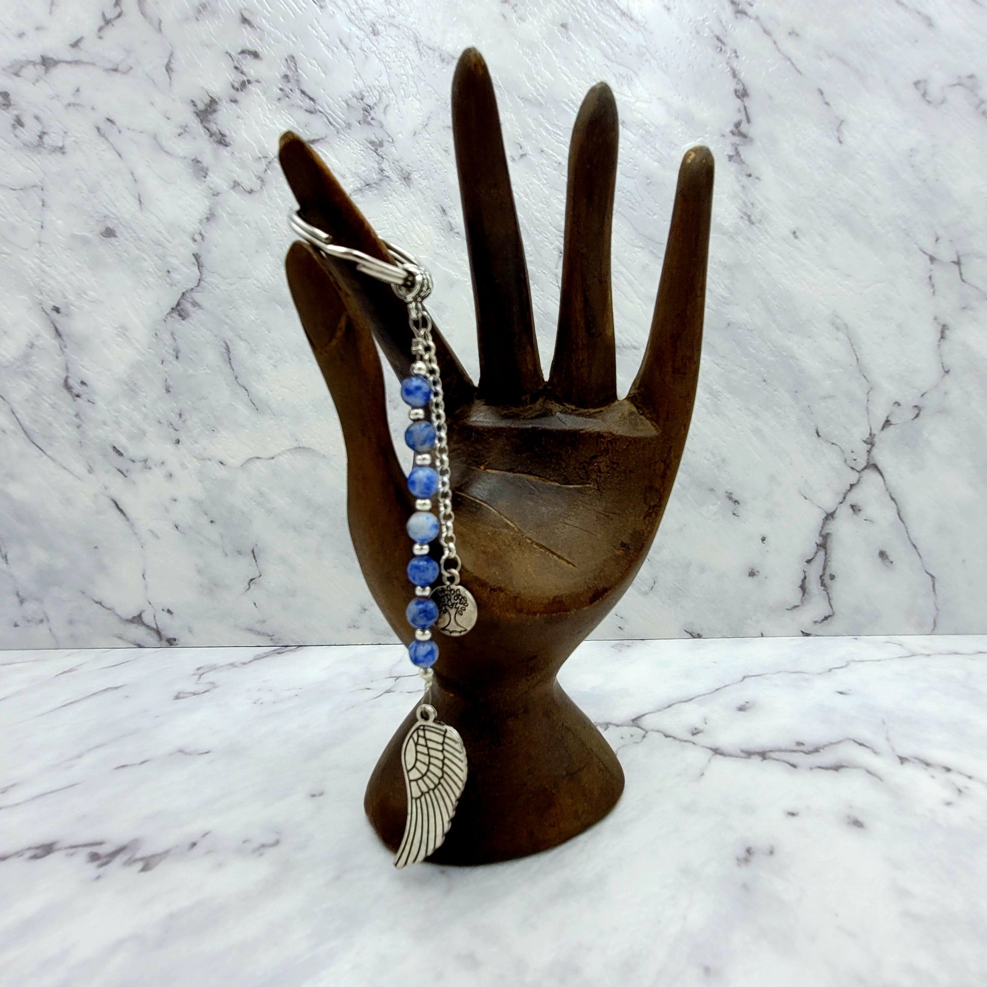 Bring balance to your life with a beautiful Sodalite Angel Wing Crystal Charm Keyring. This keyring features a spiritual Angel Wing, inspiring love and protection beneath its wings. Benefit from Sodalite's spiritual powers, as it encourages rational thought, truth and intuition, plus emotional balance and calming energy. Embrace a new level of self-esteem and self-trust.