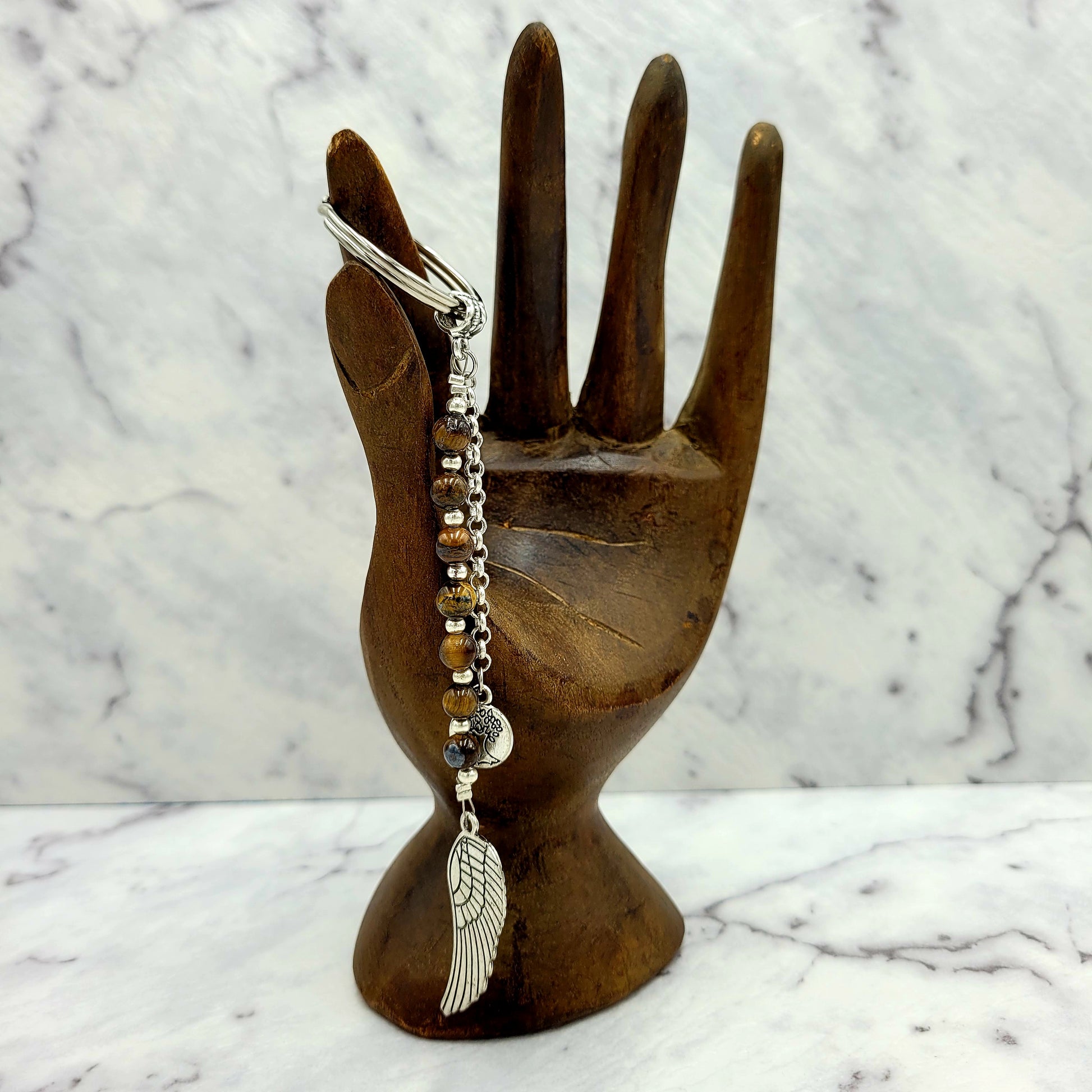 This Tiger Eye Angel Wing Crystal Charm Keyring is a spiritual talisman made of protective tiger eye stone. The angel wing charm symbolizes love, spirituality and protection, while providing a powerful shield against ill will and curses. An ideal accessory to enhance your energy and positivity.