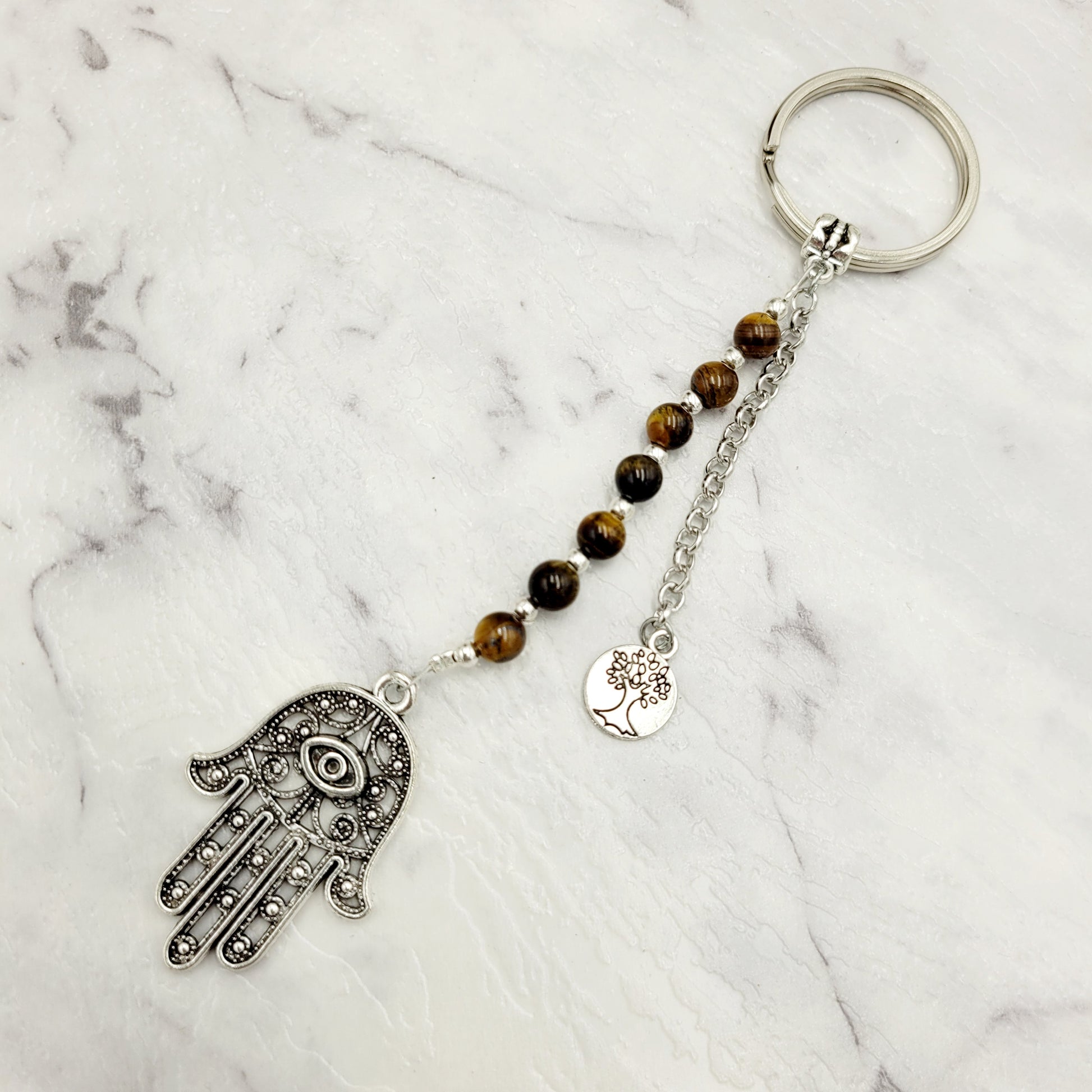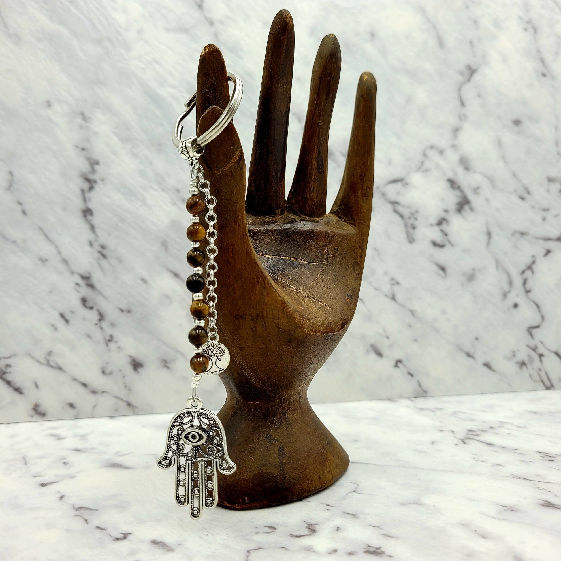 Carry the majestic power of the Tiger Eye wherever you go with our Hamsa Crystal Charm Keyring. The Tiger Eye is believed to protect your self-confidence, integrity and personal power, while the hamsa wards off negative energy and evil for good luck and protection. Stay safe and lucky with this beautiful charm.