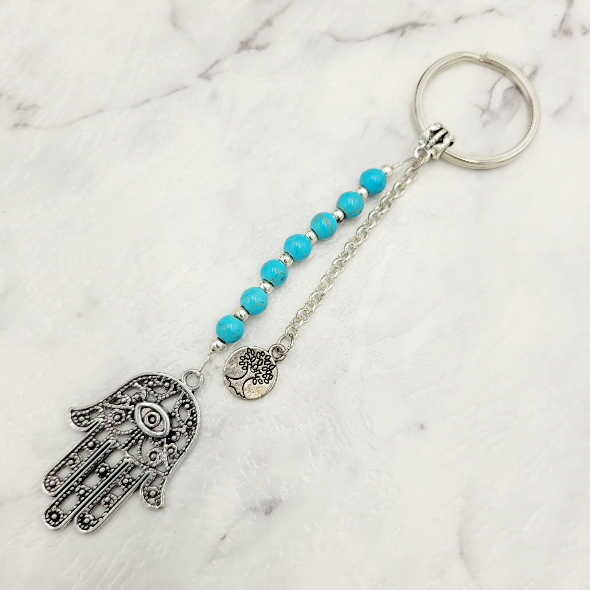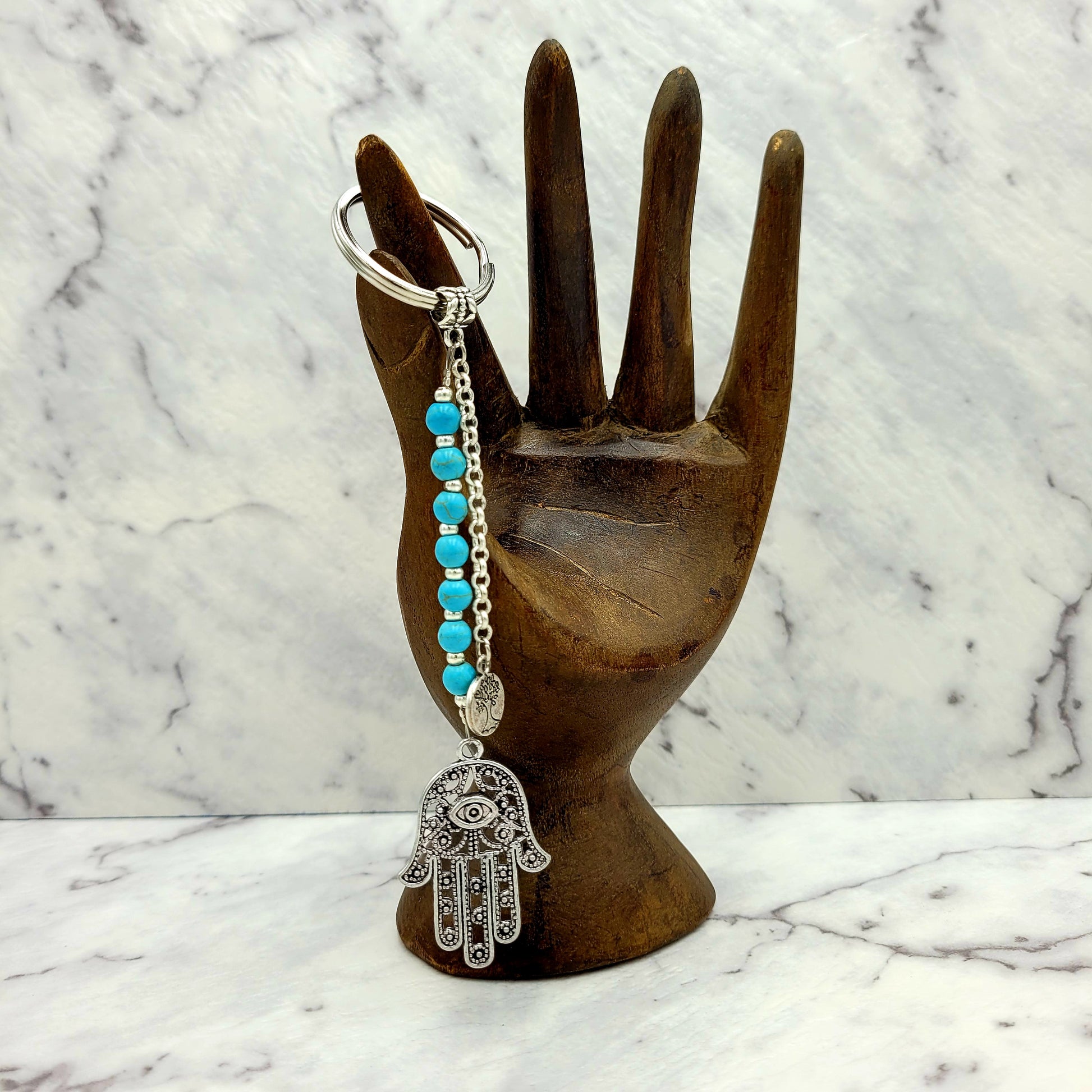Hold a touch of serenity close with this alluring Turquoise Hamsa Crystal Charm Keyring. Our classic design is crafted from genuine turquoise to connect you to a world of intuition and spirituality, offering powerful purification and protection from negative energy. Let the heavenly symbol of the hamsa invite divine energy into your life and bring you good luck as you explore the universe.